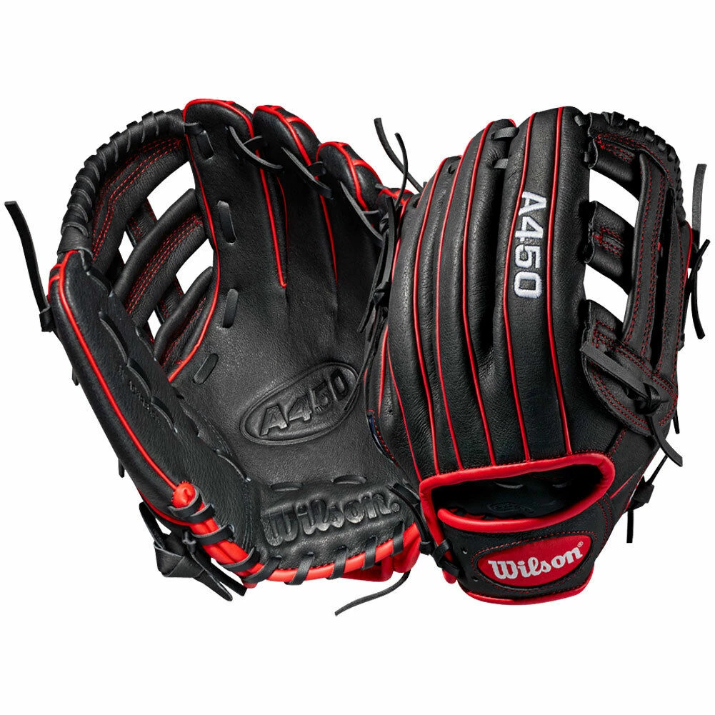 This Wilson A450 youth baseball glove (Model WTA04RB1911) has an 11-inch opening, a dual post web, real leather laces, and an open back for a traditional baseball look. Whether your young athlete is the linchpin of defense at shortstop or trapping pop flies in the outfield, you want them equipped with the best glove on the field, which is what you get with innovative Wilson baseball gloves.